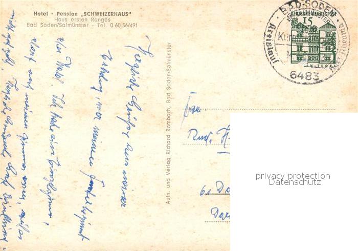 73334424 alte Postkarte Bad Soden-Salmuenster Hotel Pension Schweizerhaus postalisch gelaufen Erhaltung siehe scans [WerneD78] KatCode: 11110006435002