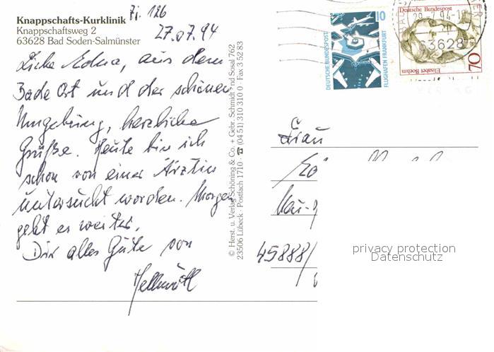 72751187 alte Postkarte Bad Soden-Salmuenster Knappschafts Kurklinik postalisch gelaufen Erhaltung siehe scans [FriedD77] KatCode: 11110006435002