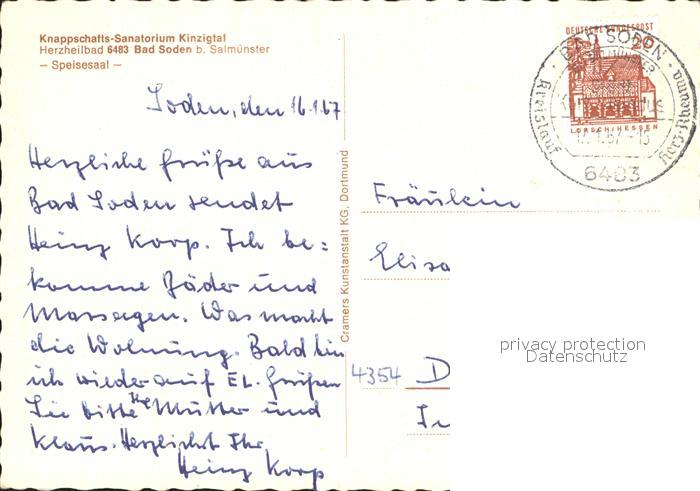 72209185 alte Postkarte Bad Soden-Salmuenster Knappschafts Sanatorium Kinzigtal Speisesaal postalisch gelaufen Erhaltung siehe scans KatCode: 11110006435002