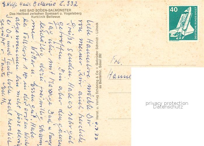 73101549 alte Postkarte Bad Soden-Salmuenster Kurklinik Bellevue postalisch gelaufen Erhaltung siehe scans [WerneD78] KatCode: 11110006435002