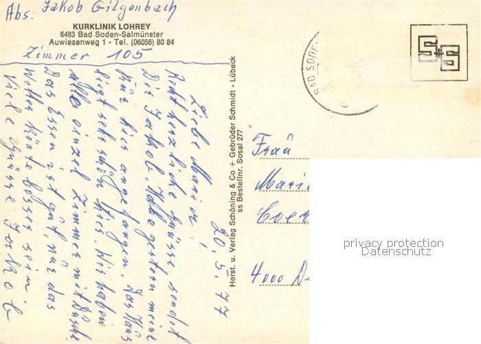 73684857 alte Postkarte Bad Soden-Salmuenster Kurklinik Lohrey Restaurant Aufenthaltsraum Patientenzimmer postalisch gelaufen Erhaltung siehe scans [FriedD77] KatCode: 11110006435002