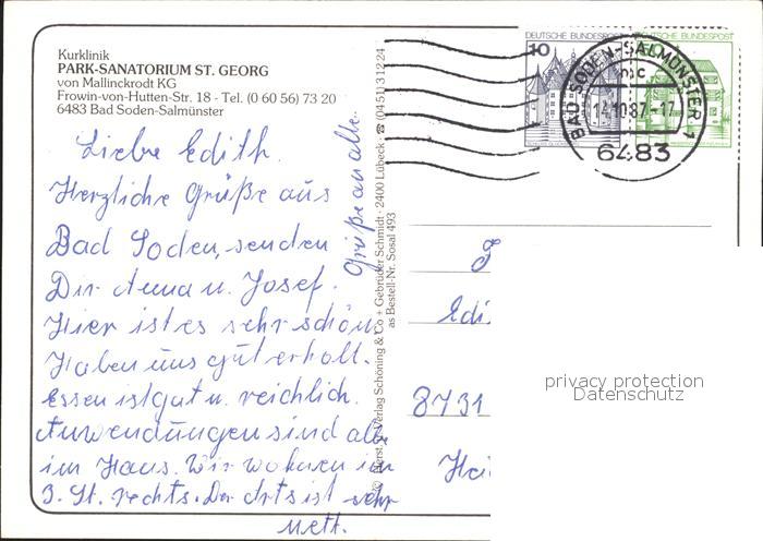 72323460 alte Postkarte Bad Soden-Salmuenster Kurklinik Park Sanatorium St Georg Zimmer Gastraum Hallenbad postalisch gelaufen Erhaltung siehe scans KatCode: 11110006435002