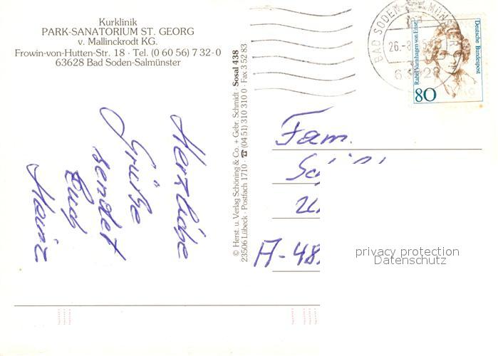73063703 alte Postkarte Bad Soden-Salmuenster Kurklinik Park-Sanatorium St. Georg postalisch gelaufen Erhaltung siehe scans [NatalD47] KatCode: 11110006435002