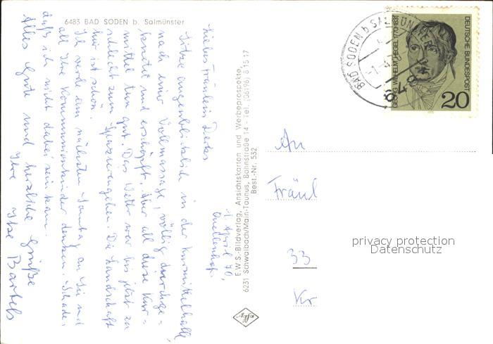 72465369 alte Postkarte Bad Soden-Salmuenster Kurviertel Blick zum Stolzenberg Kurmittelhaus Schwanenteich postalisch gelaufen Erhaltung siehe scans KatCode: 11110006435002