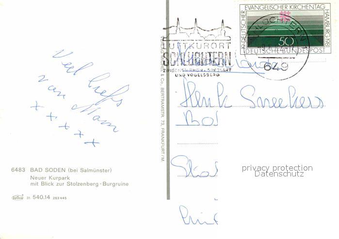 72742291 alte Postkarte Bad Soden-Salmuenster Neuer Kurpark Blick zur Stolzenberg Burgruine postalisch gelaufen Erhaltung siehe scans [FriedD77] KatCode: 11110006435002