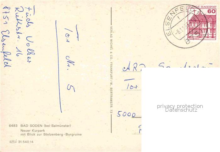 72889277 alte Postkarte Bad Soden-Salmuenster Neuer Kurpark mit Blick zur Stolzenberg Burgruine postalisch gelaufen Erhaltung siehe scans [WerneD78] KatCode: 11110006435002