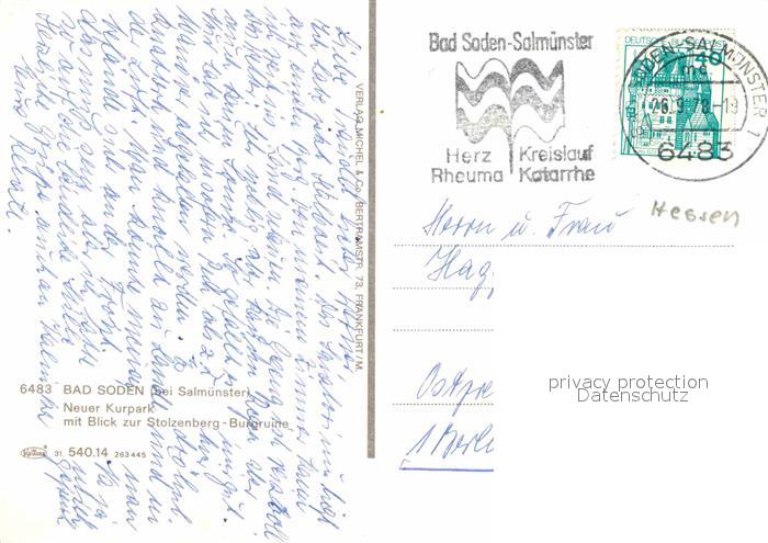 72886380 alte Postkarte Bad Soden-Salmuenster Neuer Kurpark Stolzenberg Burgruine postalisch gelaufen Erhaltung siehe scans [FriedD77] KatCode: 11110006435002