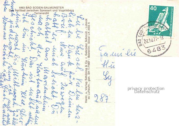 74043699 alte Postkarte Bad Soden-Salmuenster Panorama Heilbad zwischen Spessart und Vogelsberg postalisch gelaufen Fliegeraufnahme Erhaltung siehe scans [FriedD77] KatCode: 11110006435002