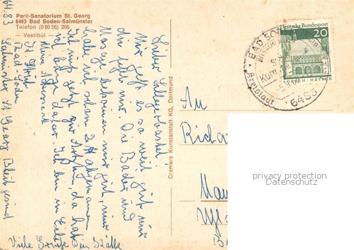 73686933 alte Postkarte Bad Soden-Salmuenster Park Sanatorium St. Georg Vestibuel postalisch gelaufen Erhaltung siehe scans [FriedD77] KatCode: 11110006435002
