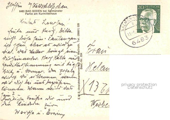 72722033 alte Postkarte Bad Soden-Salmuenster Partie am Kurmittelhaus postalisch gelaufen Erhaltung siehe scans [FriedD77] KatCode: 11110006435002