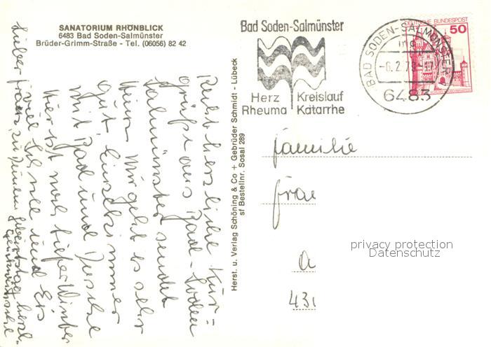 73671293 alte Postkarte Bad Soden-Salmuenster Sanatorium Rhoenblick postalisch gelaufen Erhaltung siehe scans [WerneD78] KatCode: 11110006435002