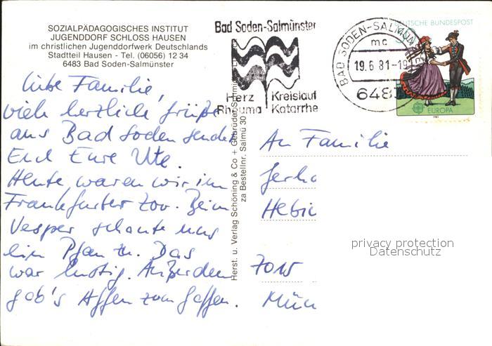 72443401 alte Postkarte Bad Soden-Salmuenster Sozialpaed Institut Jugenddorf Schloss Hausen postalisch gelaufen Erhaltung siehe scans KatCode: 11110006435002