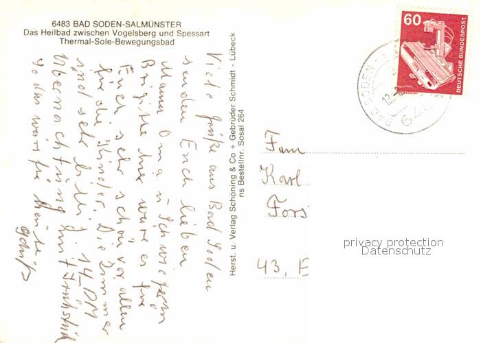 72744929 alte Postkarte Bad Soden-Salmuenster Thermal Sole Bewegungsbad Heilbad postalisch gelaufen Erhaltung siehe scans [FriedD77] KatCode: 11110006435002