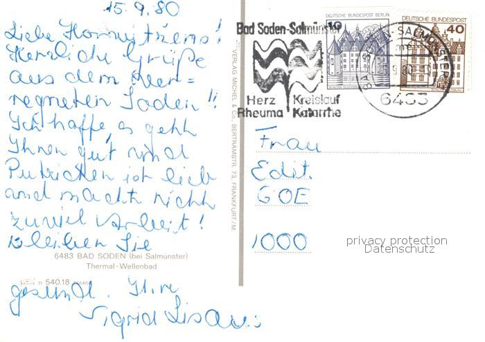 72929572 alte Postkarte Bad Soden-Salmuenster Thermal-Wellenbad postalisch gelaufen Erhaltung siehe scans [LiesaD40] KatCode: 11110006435002