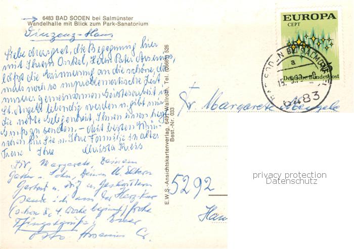 73803639 alte Postkarte Bad Soden-Salmuenster Wandelhalle mit Blick zum Park Sanatorium postalisch gelaufen Erhaltung siehe scans [WerneD78] KatCode: 11110006435002
