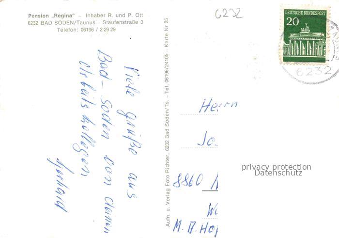 BAD SODEN Taunus Hessen Pension Regina Speisesaal Terrasse postalisch gelaufen Erhaltung siehe scans [WerneD78] alte Postkarte Wern Katcode 11110006436001
