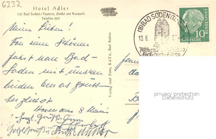 73706528 alte Postkarte Bad Soden Taunus Hotel Adler postalisch gelaufen Erhaltung siehe scans [WerneD78] KatCode: 11110006436001