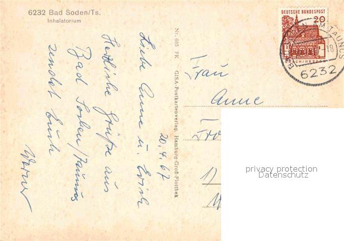 72683630 alte Postkarte Bad Soden Taunus Inhalatorium postalisch gelaufen Erhaltung siehe scans [LiesaD40] KatCode: 11110006436001