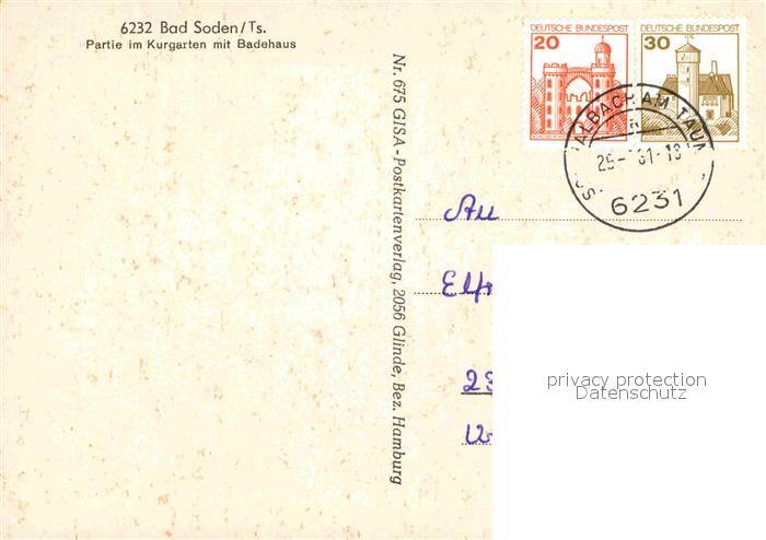 72793503 alte Postkarte Bad Soden Taunus Partie im Kurgarten mit Badehaus postalisch gelaufen Erhaltung siehe scans [FriedD77] KatCode: 11110006436001