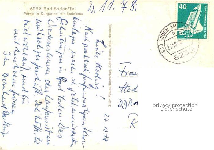 72886616 alte Postkarte Bad Soden Taunus Partie im Kurgarten mit Badehaus postalisch gelaufen Erhaltung siehe scans [FriedD77] KatCode: 11110006436001