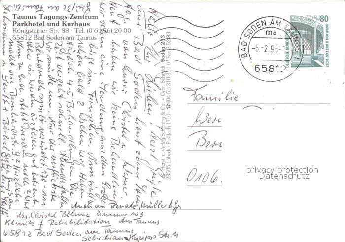 72372381 alte Postkarte Bad Soden Taunus Tagungszentrum Parkhotel Kurhaus Springbrunnen postalisch gelaufen Erhaltung siehe scans KatCode: 11110006436001