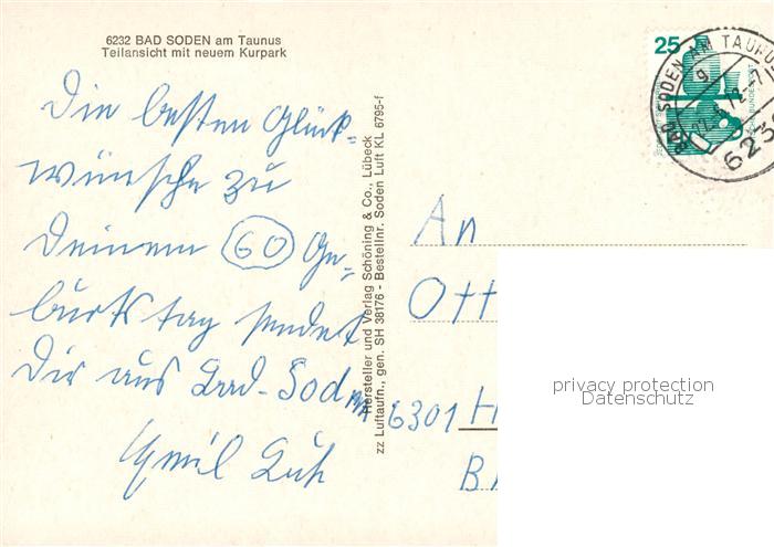 73852539 alte Postkarte Bad Soden Taunus Teilansicht mit Neuem Kurpark Fliegeraufnahme postalisch gelaufen Erhaltung siehe scans [WerneD78] KatCode: 11110006436001