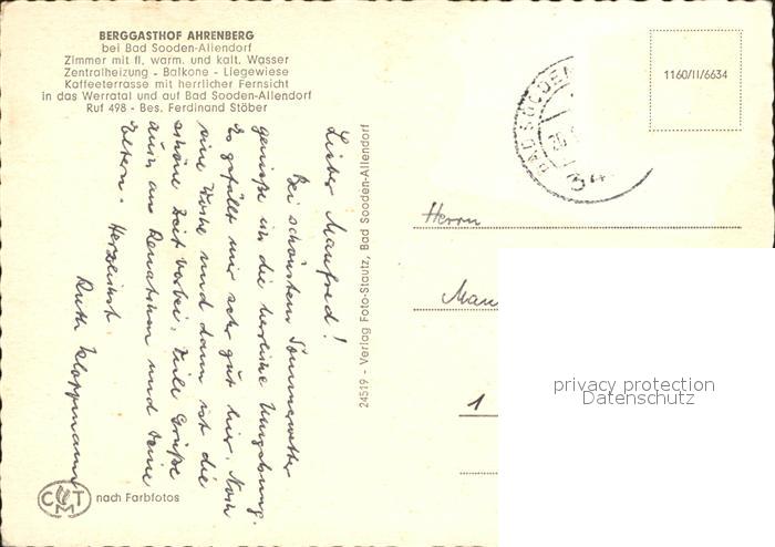 72139604 alte Postkarte Bad Sooden-Allendorf Berggasthof Ahrenberg Terrasse Gastraum postalisch gelaufen Erhaltung siehe scans KatCode: 11110006636001