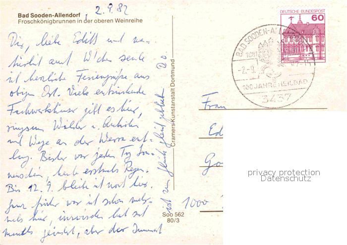 72890029 alte Postkarte Bad Sooden-Allendorf Froschkoenigbrunnen Weinreihe Fachwerkhaeuser postalisch gelaufen Erhaltung siehe scans [FriedD77] KatCode: 11110006636001