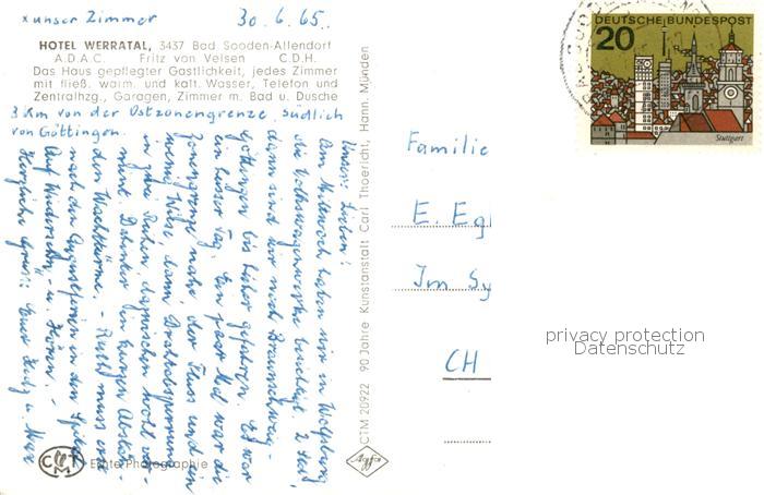 73830295 alte Postkarte Bad Sooden-Allendorf Hotel Werratal Kurhaus Am Fischerstad Marktplatz postalisch gelaufen Erhaltung siehe scans [FriedD77] KatCode: 11110006636001