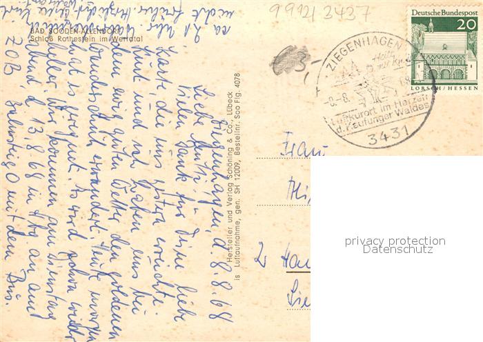 73169527 alte Postkarte Bad Sooden-Allendorf Schloss Rothestein im Werratal Fliegeraufnahme postalisch gelaufen Erhaltung siehe scans [FriedD77] KatCode: 11110006636001