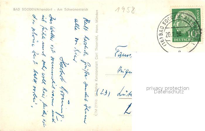 73140553 alte Postkarte Bad Sooden-Allendorf Teilansicht mit Schwanenteich postalisch gelaufen Erhaltung siehe scans [FriedD77] KatCode: 11110006636001