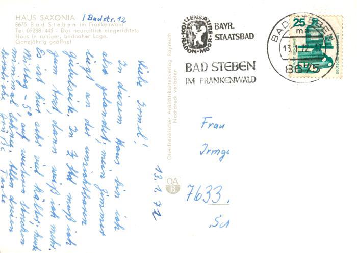 73940547 alte Postkarte Bad Steben Gaestehaus Pension Haus Saxonia postalisch gelaufen Erhaltung siehe scans [FriedD77] KatCode: 11110009475112