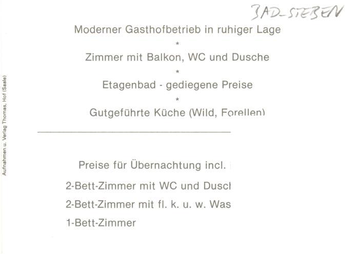 73923660 Bad Steben Gasthof Hubertus Gastraeume Zimmer postalisch nicht gelaufen Werbekarte (keine Postkarte) Erhaltung siehe scans [WerneD78] KatCode: 11110009475112