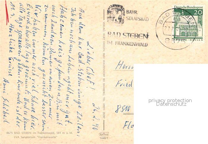 72771710 alte Postkarte Bad Steben LVA Sanatorium Frankenwarte postalisch gelaufen Erhaltung siehe scans [WerneD78] KatCode: 11110009475112