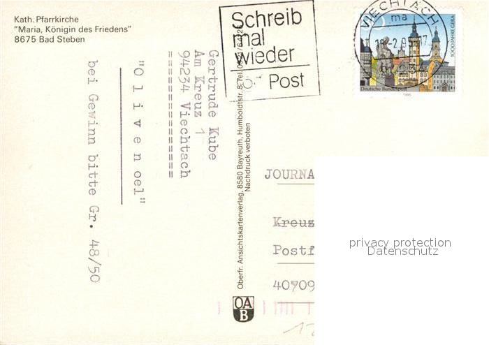 72934112 alte Postkarte Bad Steben Pfarrkirche Maria K?nigin des Friedens postalisch gelaufen Erhaltung siehe scans [LiesaD40] KatCode: 11110009475112