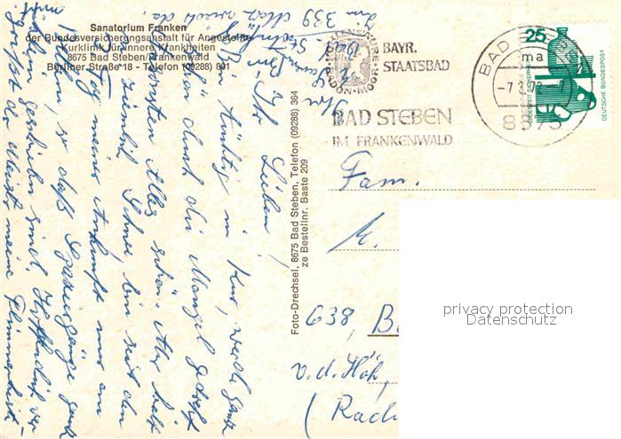 72701207 alte Postkarte Bad Steben Sanatorium Franken postalisch gelaufen Erhaltung siehe scans [KathaD79] KatCode: 11110009475112
