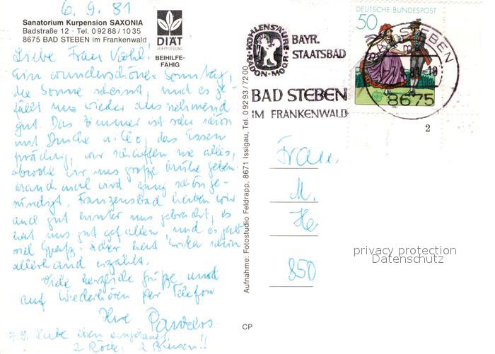 72991314 alte Postkarte Bad Steben Sanatorium Kurpension Saxonia postalisch gelaufen Erhaltung siehe scans [WerneD78] KatCode: 11110009475112