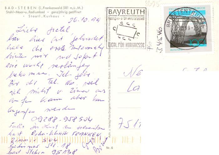 73941292 alte Postkarte Bad Steben Staatliches Kurhaus postalisch gelaufen Erhaltung siehe scans [FriedD77] KatCode: 11110009475112