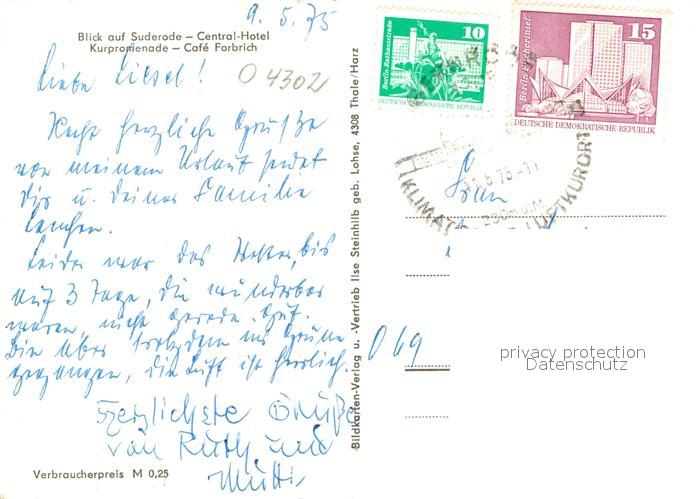 72968668 alte Postkarte Bad Suderode Ortsansicht mit Kirche Central Hotel Kurpromenade Cafe Forbrich postalisch gelaufen Erhaltung siehe scans [FriedD77] KatCode: 11110015085035