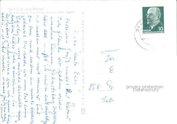 72055269 alte Postkarte Bad Suderode Sanatorium fuer Staublungenkranke Willi Agatz postalisch gelaufen Erhaltung siehe scans KatCode: 11110015085035