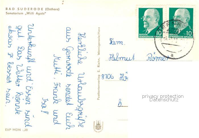 73163181 alte Postkarte Bad Suderode Sanatorium Willi Agatz postalisch gelaufen Erhaltung siehe scans [WerneD78] KatCode: 11110015085035