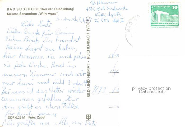 72704474 alte Postkarte Bad Suderode Silikose Sanatorium Willy Agatz postalisch gelaufen Erhaltung siehe scans [FriedD77] KatCode: 11110015085035