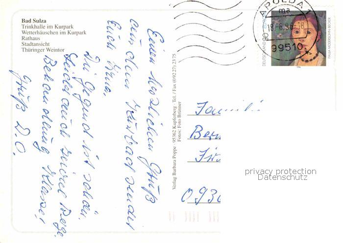 72650880 alte Postkarte Bad Sulza Trinkhalle Kurpark Wetterhaeuschen Rathaus Stadtansicht Thueringer Weintor postalisch gelaufen Erhaltung siehe scans [FriedD77] KatCode: 11110016071004