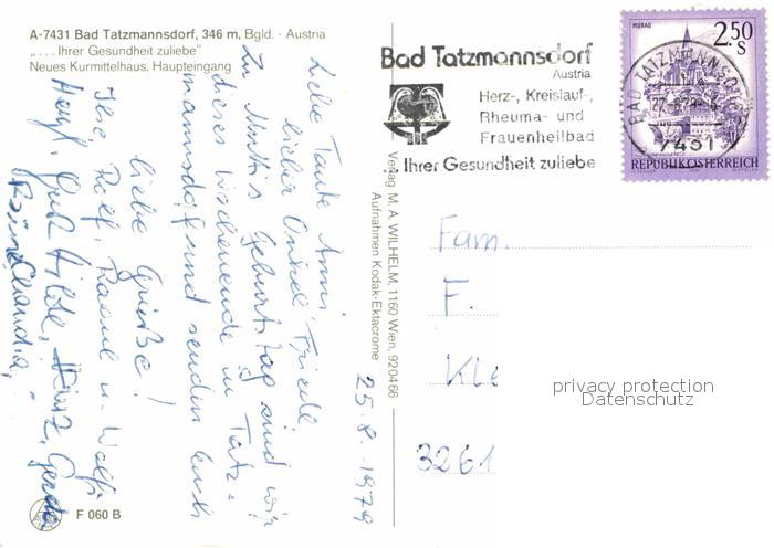 72761856 alte Postkarte Bad Tatzmannsdorf Burgenland Kurmittelhaus Haupteingang postalisch gelaufen Erhaltung siehe scans [LiesaD40] KatCode: 11390113010901