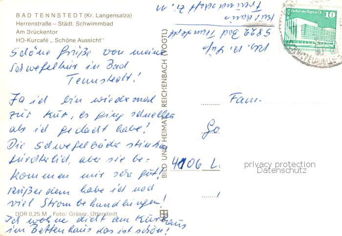 73859301 alte Postkarte Bad Tennstedt Herrenstrasse Staedt Schwimmbad Am Brueckentor HO Kurcafe Schoene Aussicht postalisch gelaufen Erhaltung siehe scans [WerneD78] KatCode: 11110016064004