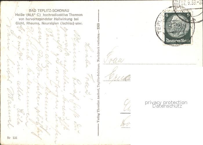 old postcard Bad Teplitz-Schoenau Heisse hochradioaktive Thermen postalisch gelaufen Erhaltung siehe scans