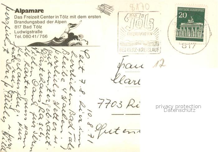 73724371 alte Postkarte Bad Toelz Alpamare Freizeit Center Brandungsfreibad Sprudelfreibad Jodtherme postalisch gelaufen Erhaltung siehe scans [LiesaD40] KatCode: 11110009173112