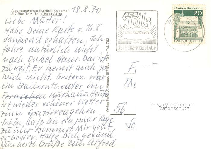 73680033 alte Postkarte Bad Toelz Alpensanatorium Kurklinik Kaiserhof postalisch gelaufen Erhaltung siehe scans [LiesaD40] KatCode: 11110009173112