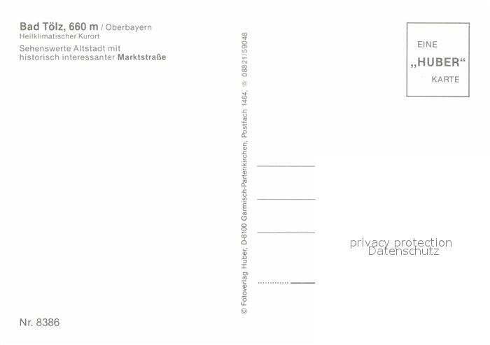 72846186 Bad Toelz Altstadt mit Marktstrasse Denkmal Kurort Huber Karte Nr 8386 postalisch nicht gelaufen Erhaltung siehe scans [FriedD77] KatCode: 11110009173112