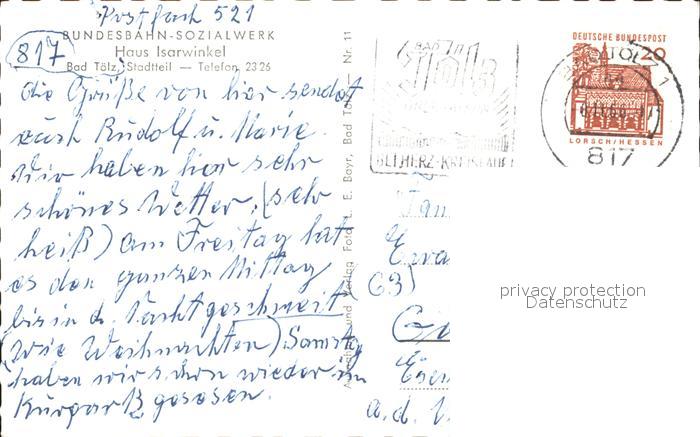 71982325 alte Postkarte Bad Toelz Bundesbahn Sozialwerk Haus Isarwinkel postalisch gelaufen Erhaltung siehe scans KatCode: 11110009173112
